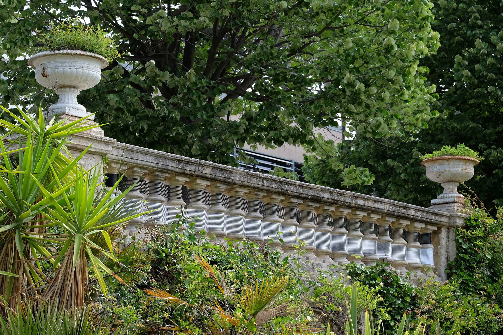 balustres scoubidou - fil pvc noir et blanc de Ø 4mm - environ 70 x 600 x 30 cm. OEuvre in situ réalisée pour «Occurrence» la 14e édition des Arts Éphémères - Parc de Maison Blanche Marseille - mai/juin 2022 - © photos Arnaud Duboistesselin. Les éléments architecturaux du balcon central surplombant les jardins sont transformés pour en faire surgir une autre perception. Une série de balustres est habillée d'un tressage de fil polyester noir et blanc selon un plan structurel régulier. Cette oeuvre réhabilite le « scoubidou », ce produit commun à toute génération, qui avant d’être ludique, fut un matériau privilégié par le design de l’ameublement des années 50 / 60. Deux matériaux que tout parait opposer : la pierre et le plastique, se rencontrent et s’imposent ainsi au regard par leur aspect décalé. N.B. le fil PVC est récupéré pour une autre possible installation.
