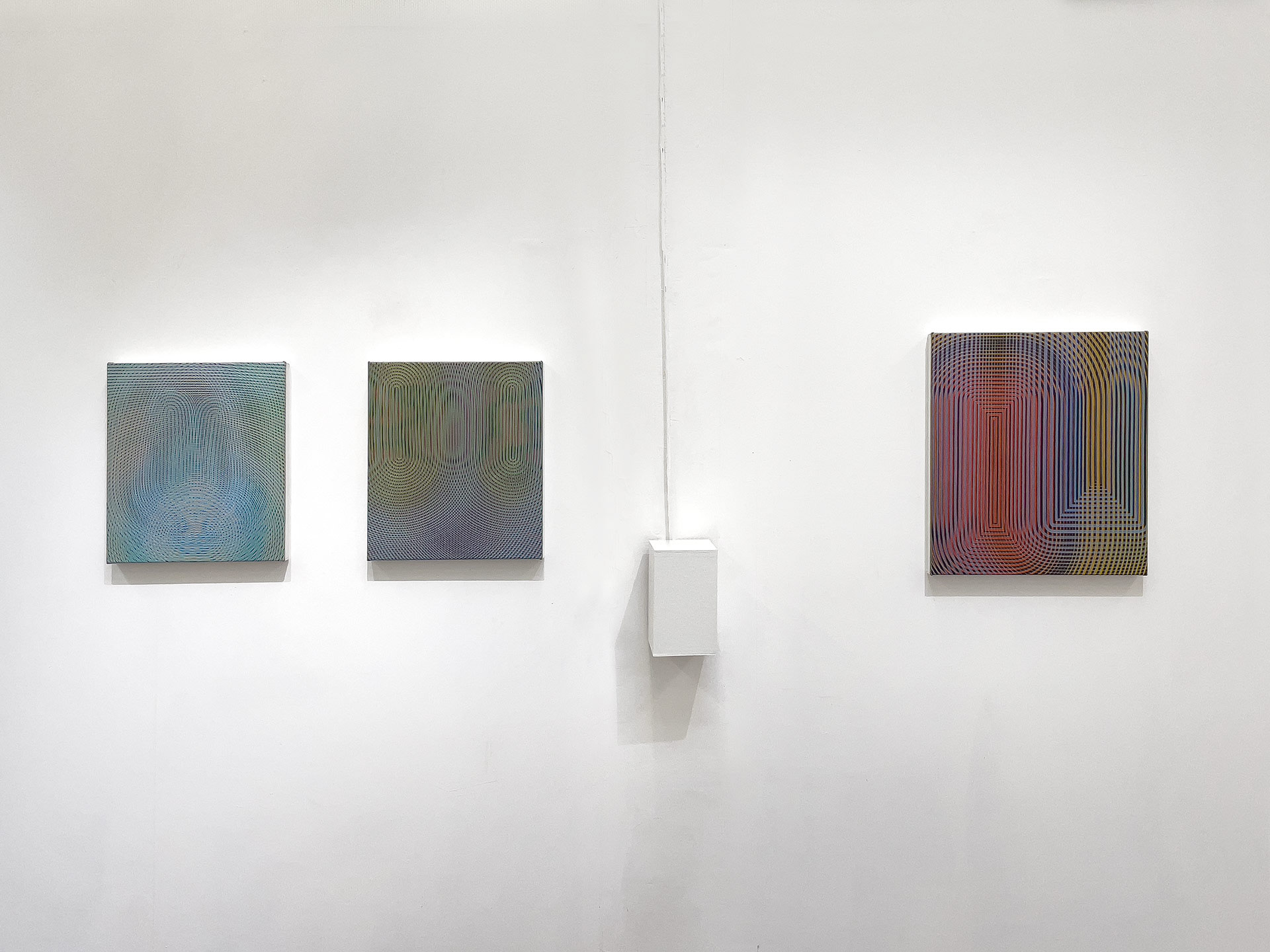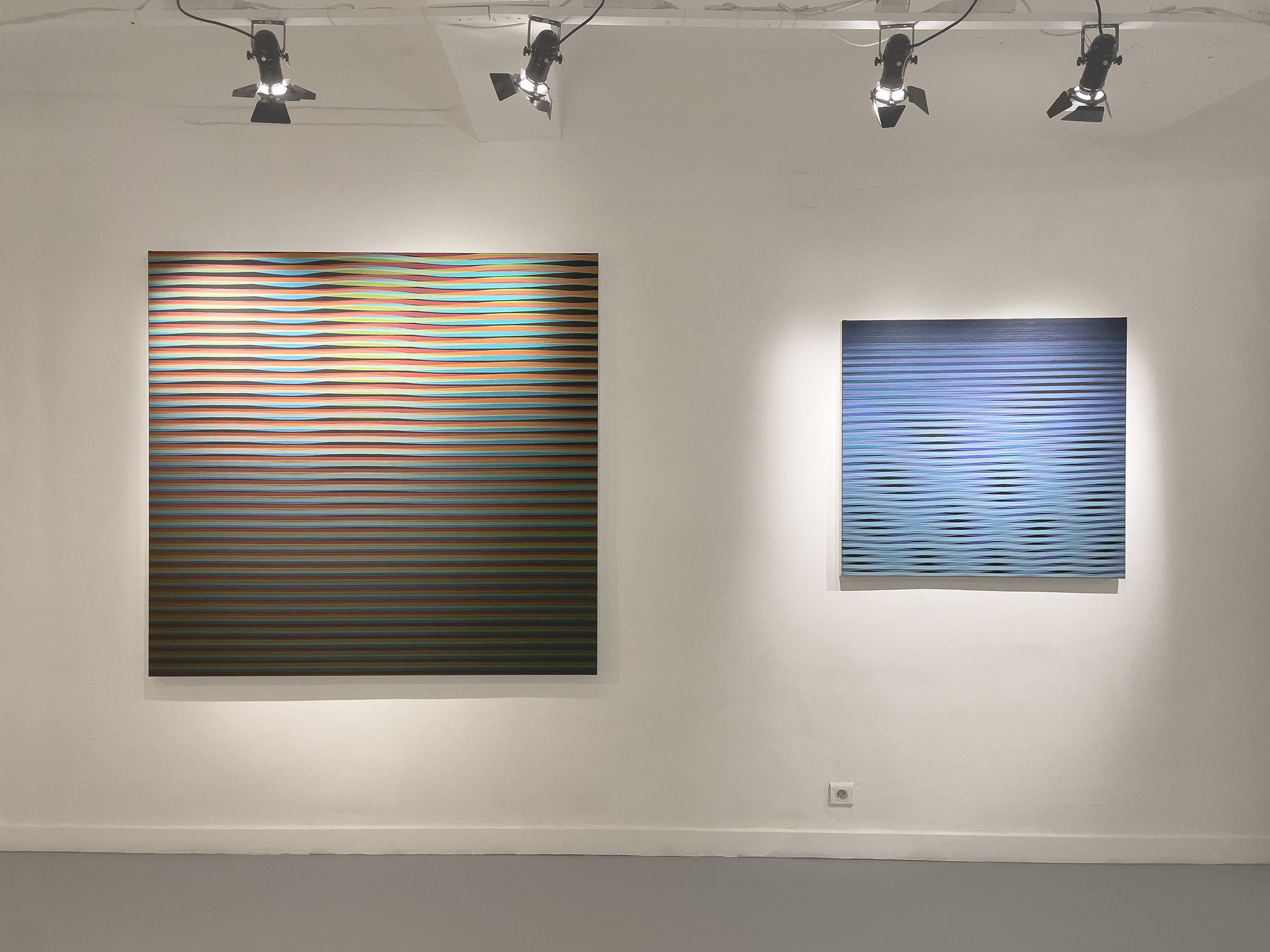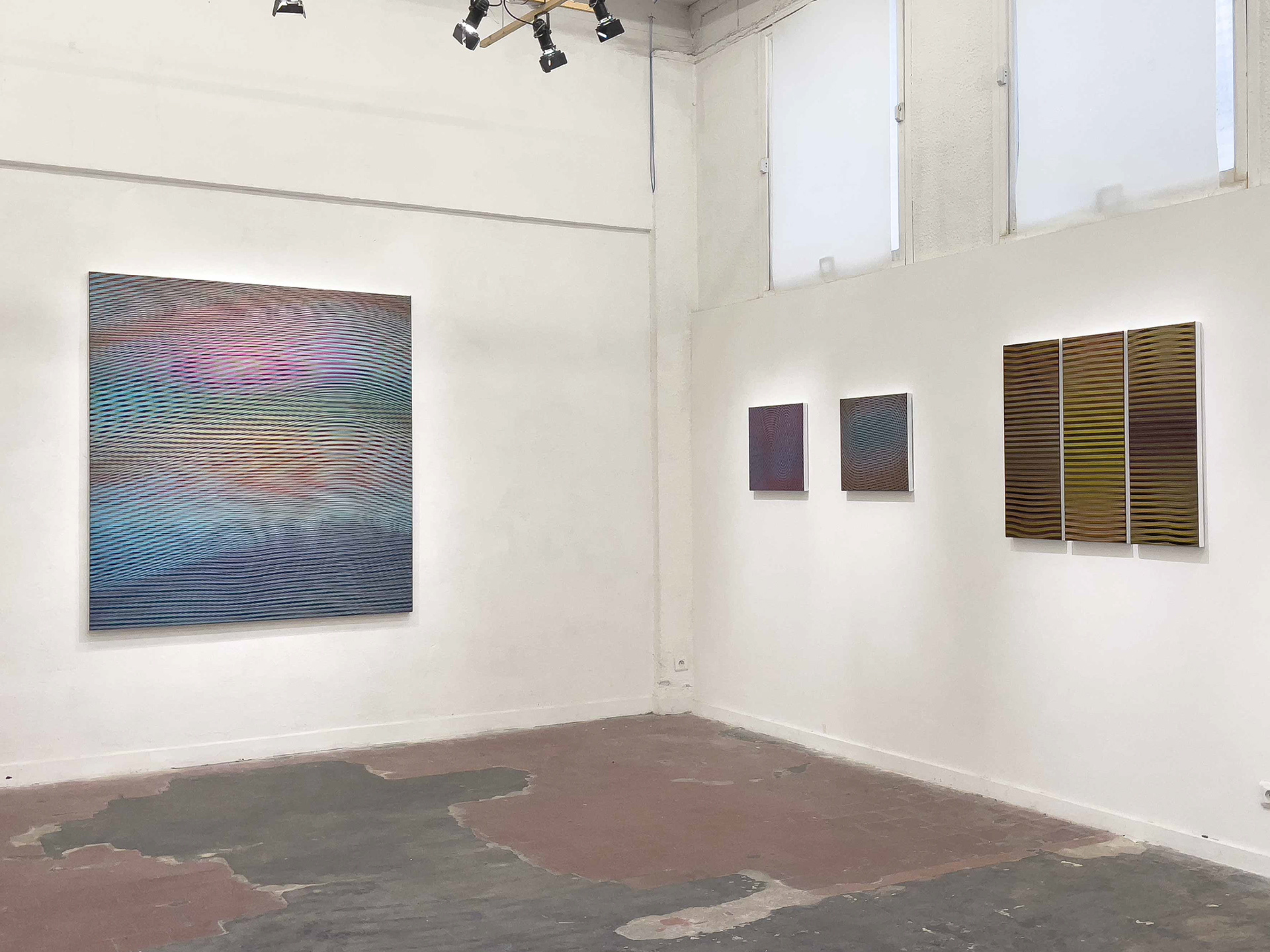 3 oeuvres réalisées en fil PVC sur châssis métal sont accrochées dans la salle de bain. Une grande peinture à base de pigments iridescents est posée comme couvre-lit.