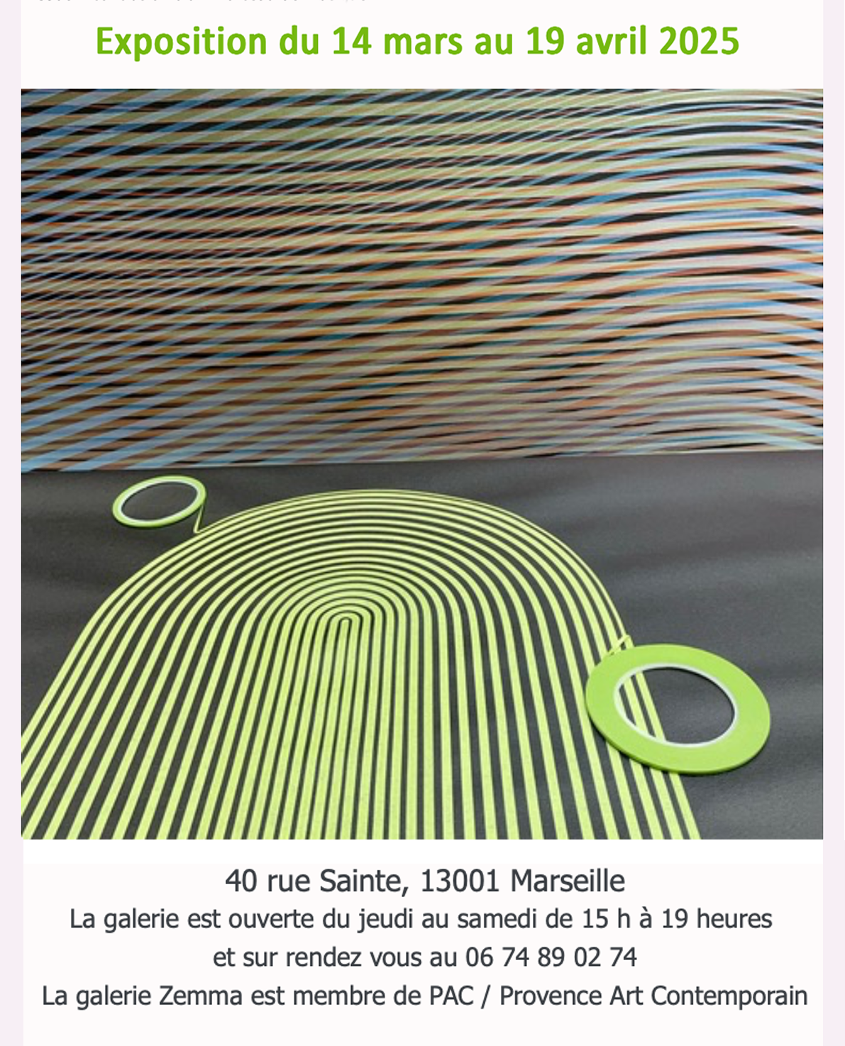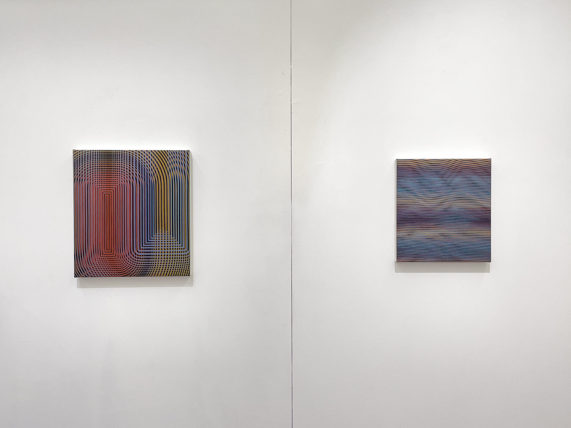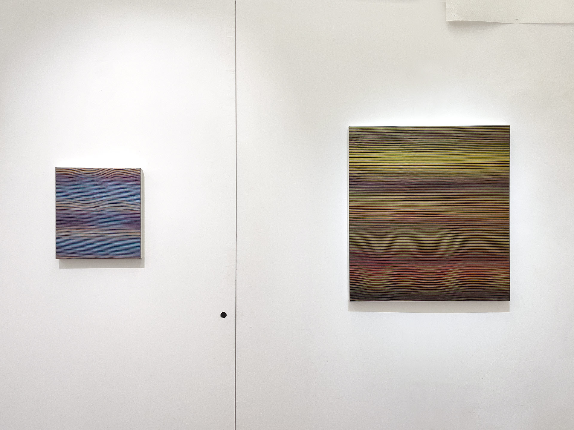 3 oeuvres réalisées en fil PVC sur châssis métal sont accrochées dans la salle de bain. Une grande peinture à base de pigments iridescents est posée comme couvre-lit.