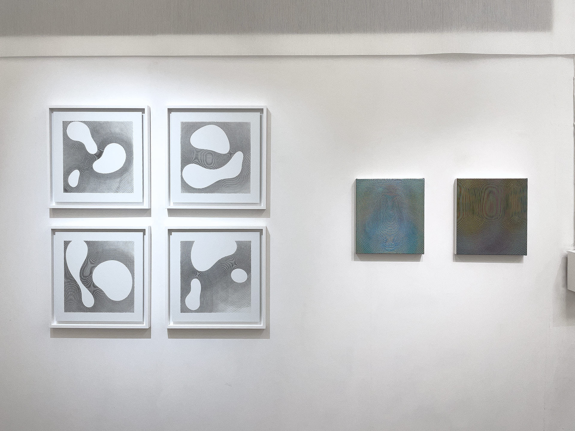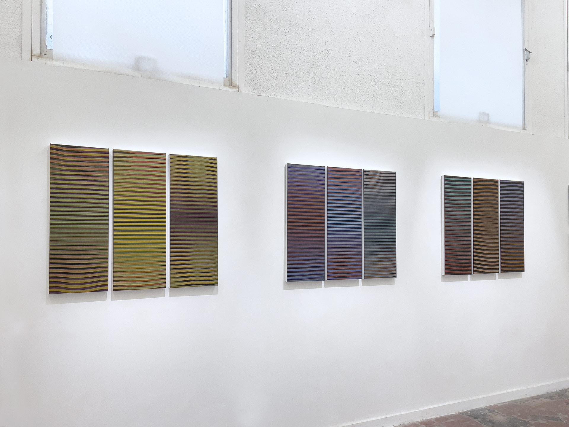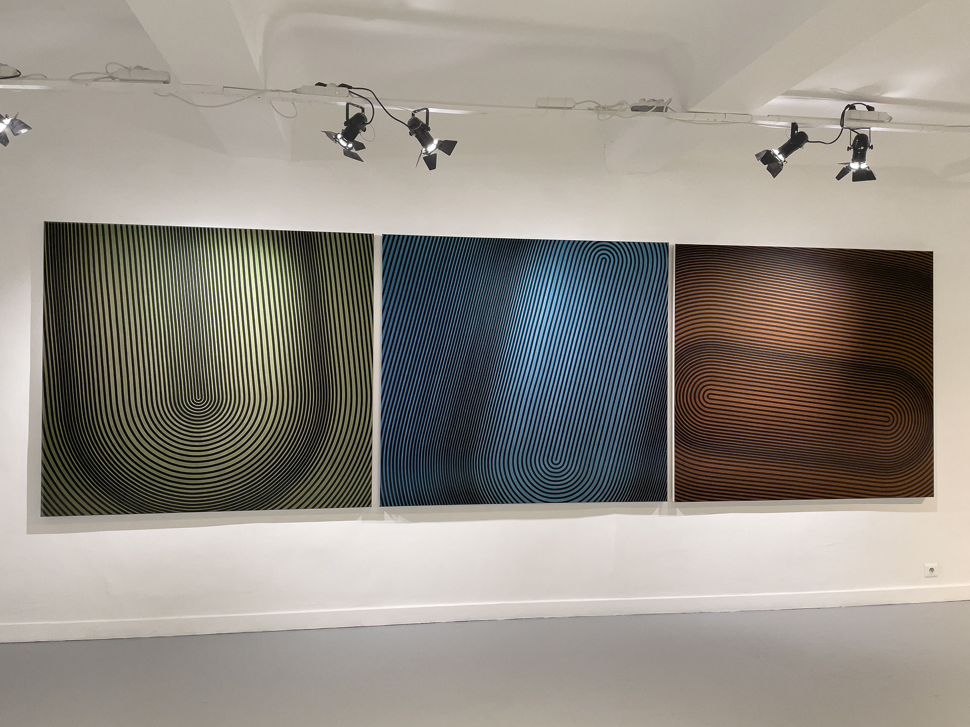 3 oeuvres réalisées en fil PVC sur châssis métal sont accrochées dans la salle de bain.