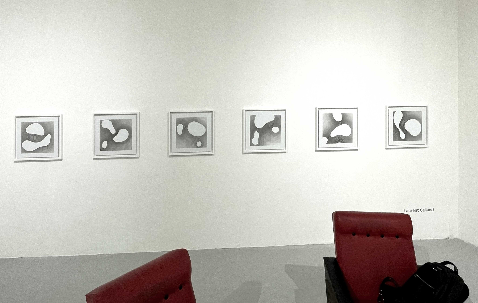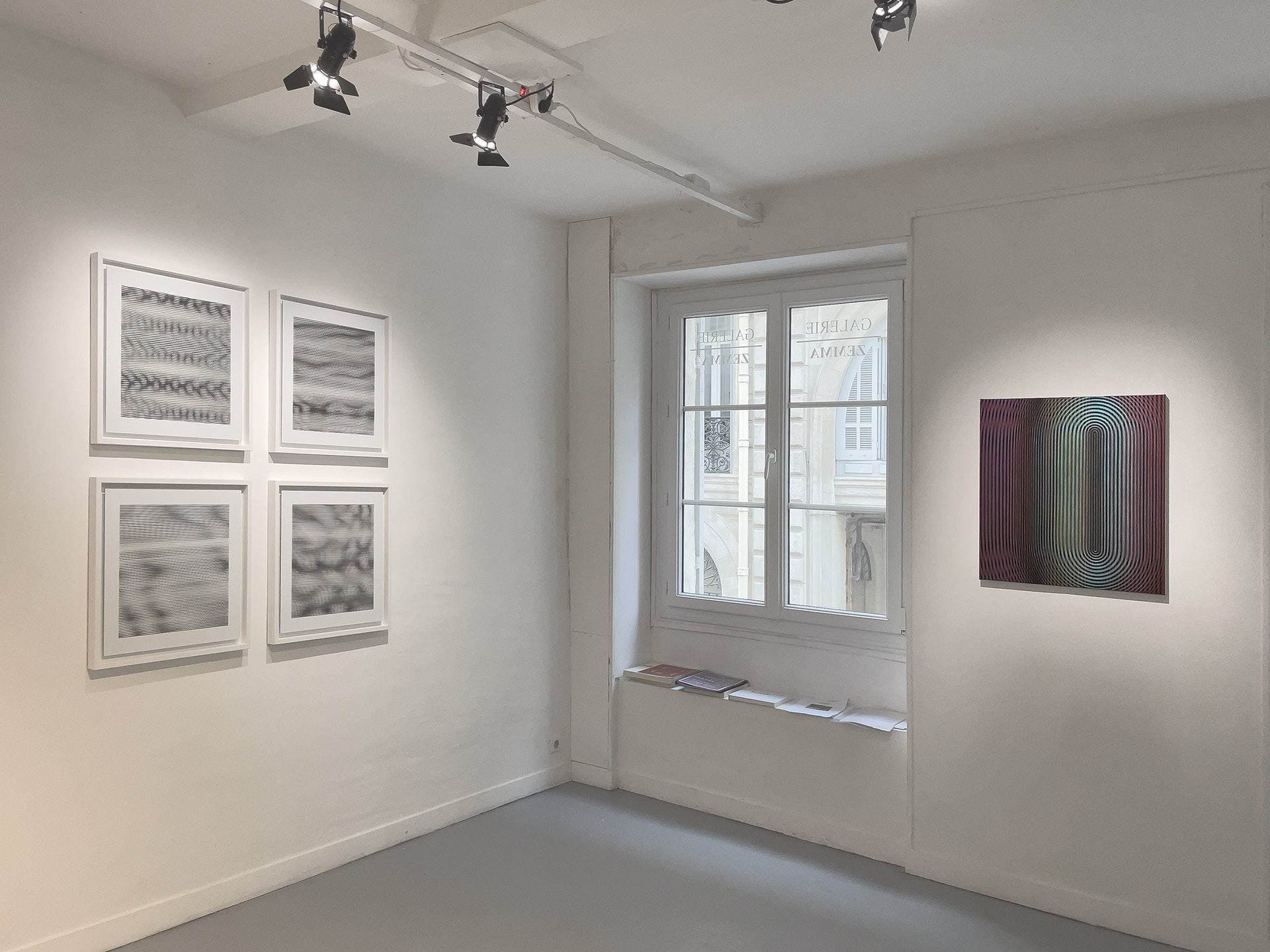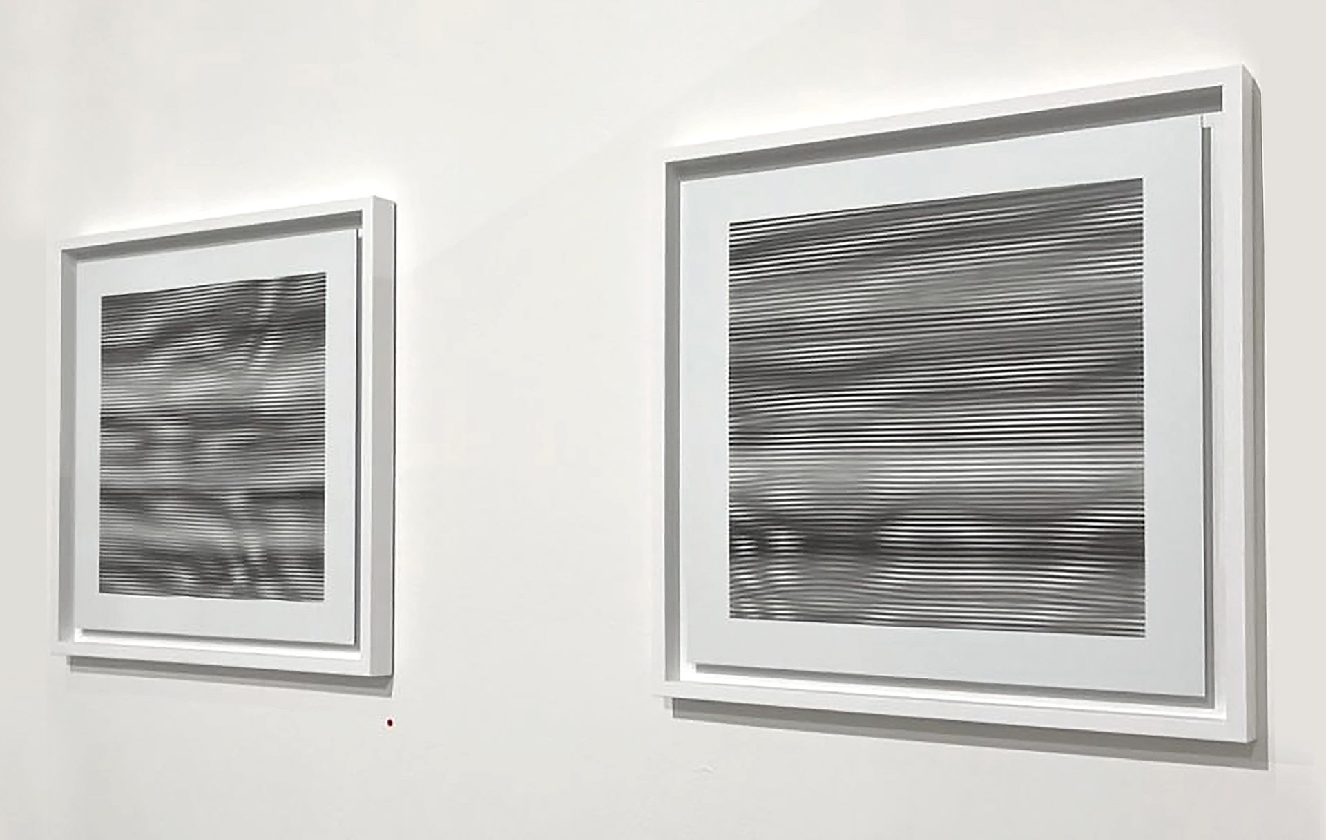 3 oeuvres réalisées en fil PVC sur châssis métal sont accrochées dans la salle de bain.